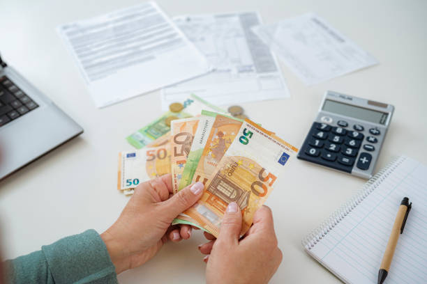 Close-up of woman's hands counting Euro banknotes planning home finances.