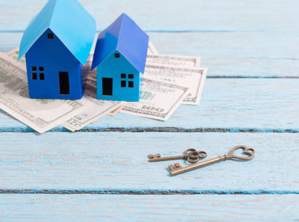 Houses made of paper, keys and money on a wooden background